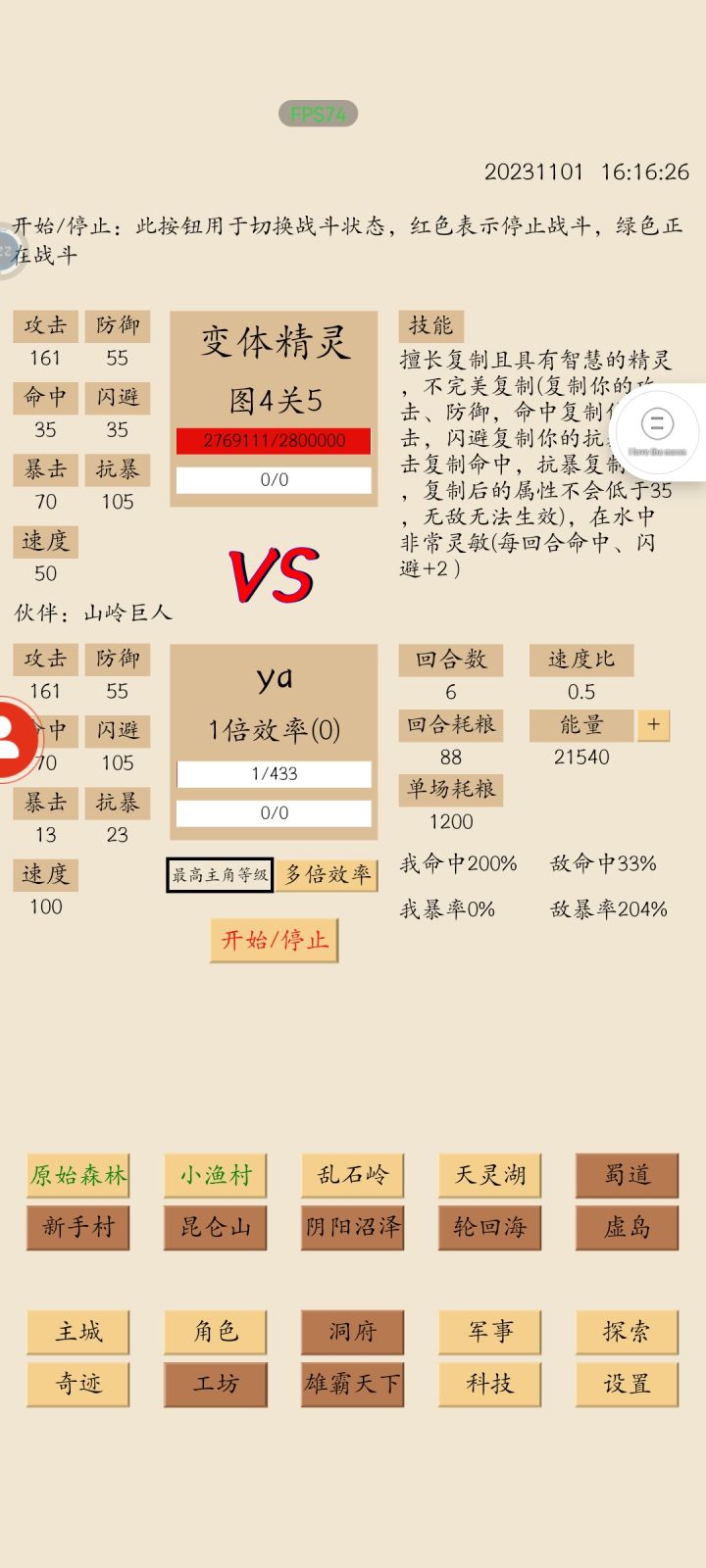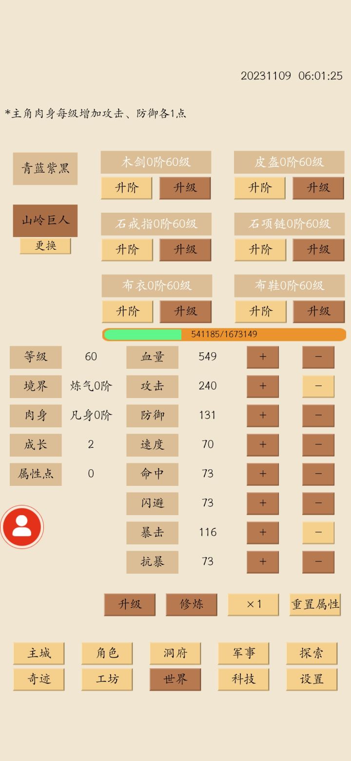 目前世界等级75。60多卡一会还是有点性价比的,但是总归产量也就是75级左右的水平,除非玩的是小号,不然不建议60级打炼金,性价比不是特别高,就算有新科技加人口也是杯水车薪。攻击属性来源:1、伙伴等级。1-5分别是40/40/50/50/60。提供21-10的属性2、军事:弓兵41-4,骑兵21-23、科技:瞄准15,骑术10我防御太低所以打前面没法用防御磨血的方式,只能硬莽,其中打前半