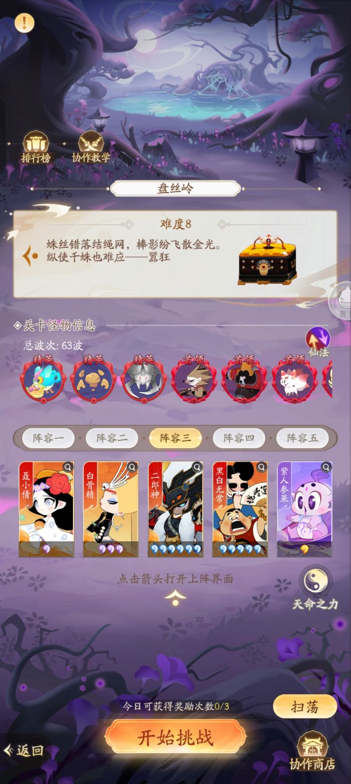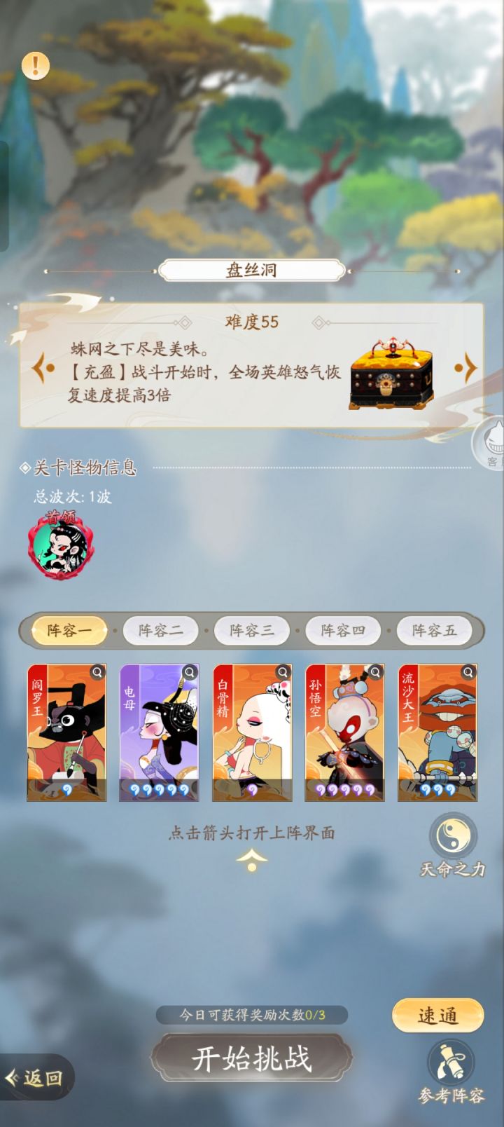 (六)玩法地图攻略,①登神天阶,前面1000关左右推荐阵容是孙悟空,牛魔王,白骨精,铁扇公主,玉面狐狸(也可换为黑白无常)。2000关以后用猴子,白骨,牛魔,黑白,文曲。官方在3.8号加强了牛魔王一波,而且本人亲自测试,手动把登神天阶从第一关打到第1200关(本人也一直在手动打登神天阶)只有2%的失败概率。用第一套阵容打到2000关以后,就比较吃力,打不过就换第二套阵容。②盘丝洞,推荐阵容是阎王