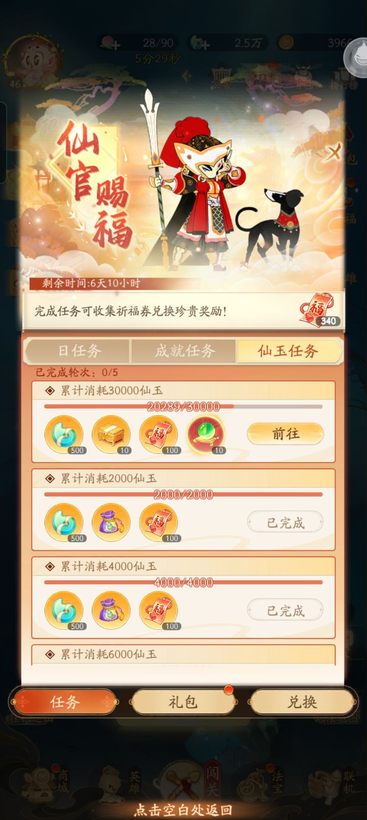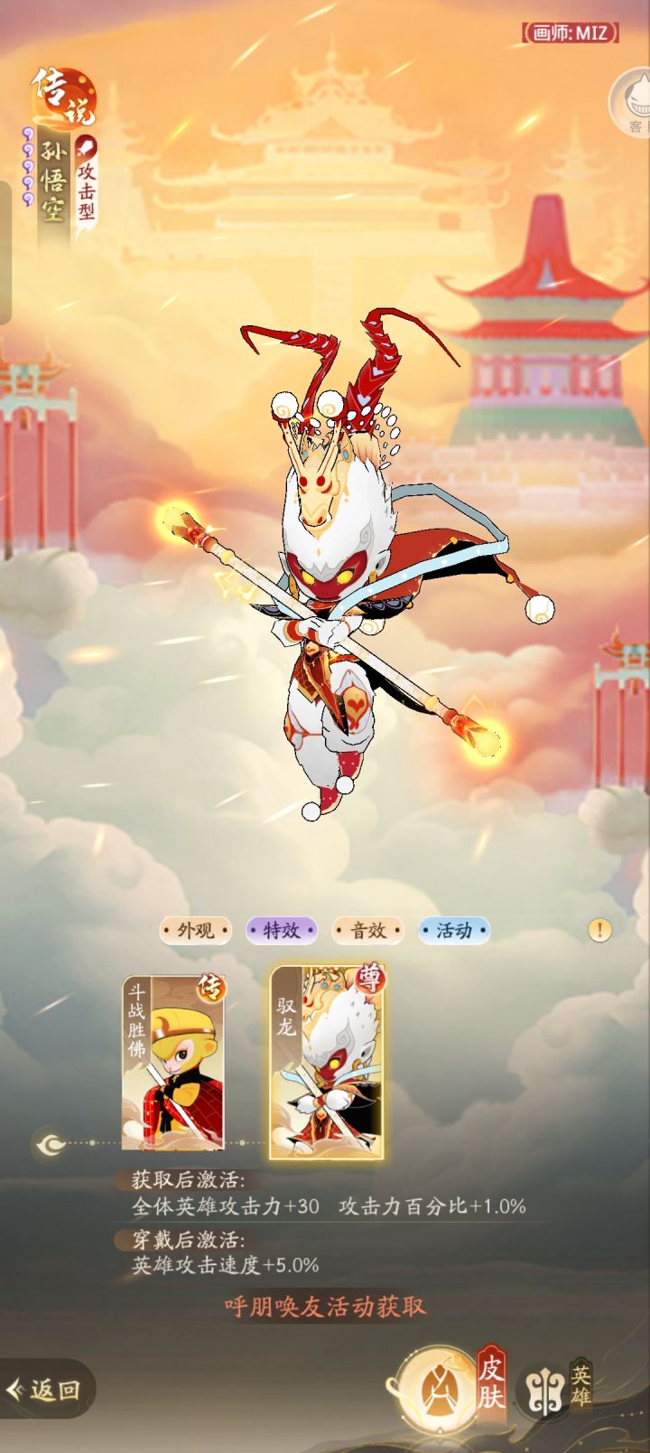 (十)呼朋唤友活动,这个活动只需要你邀请三位玩家充月卡或者赠送月卡给你邀请的玩家,完成相应任务就行了,当然可以自己开小号充月卡完成任务获取孙悟空的至尊皮肤––御龙(十一)协作共斗玩法,这个玩法比较难,需要玩家和大佬一起打,不到10000攻击力可能都打不过难度6,但是让大佬输出,自己辅助,这样会比较轻松,如果自己找不到大佬带,那请玩家还是放心扫荡。协作共斗辅助阵容选黑白无常,紫人参果,白骨精,二郎