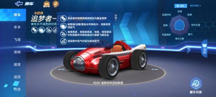 追梦者-EBS是2021年10月1日S14赛季参与金秋狂欢活动获得的一辆传说双栖车,是一辆辅助后追车。作为一辆免费的传说双栖车,追梦者-EBS在组队道具赛中还是可以起到不错的辅助掩护作用。追梦者-EBS的3个特殊道具中,黄金导弹进行单点攻击,踩中四种地面垃圾高概率对释放者进行催眠飞碟反击,被三种水炸弹命中高概率获得超级氮气以及氮气百分百升级为超级氮气加强了后追。和林中山轿不同的是,追梦者-EBS比