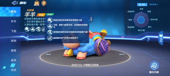 羊羊是2021年9月3日S14赛季No.14期荣誉通行证80级获得的一辆传说道具车,是一辆辅助后追车。作为新一期的道具车,外形呆萌可爱,和梦之乡相比,羊羊获取飞碟的概率更高,数量也更多,不过羊羊的防御能力不足,后追时受到攻击可能会影响追击的速度,羊羊在组队道具赛可以发挥一定的作用,个人道具赛中基本没有用处,随着催眠飞碟越来越多,领跑的压力和难度也会逐渐增大。