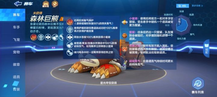 森林巨熊是2021年8月25日S14赛季通过星光夺宝获得的一辆传说双栖车,是一辆辅助领跑车。作为第5辆传说双栖赛车,森林巨熊有着非常强悍的基础属性,也是第一辆拥有纯竞速属性的双栖赛车。一技能和迪斯欧德战车相似,区别从高概率变成了百分百概率,此技能当森林巨熊领跑时可以发挥巨大的作用,只要对手持续攻击,理论上可以触发无限护盾,不过护盾防御任意道具成功时再次获得护盾效果时有较短时间的间隔,无法防御同一时