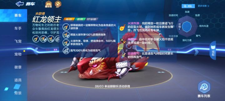 红龙领主是2022年6月3日S18赛季通过幸运翻翻乐活动获得的一辆传说道具车。是一辆辅助上位车。红龙领主是第四辆道具赛中任意位置可以获得核心道具的赛车,火球炸弹类似于夺旗赛中的滚动水炸弹,无需瞄准,攻击方向随着当时赛道的地形而改变,距离近时属于瞬发,距离远时爆炸有一定的延时性,由于火球炸弹属于非指向性攻击道具,碰到地形或车辆会立即发生爆炸,炸飞范围内的所有车辆,在组队赛中难免会误伤队友,需要看准时