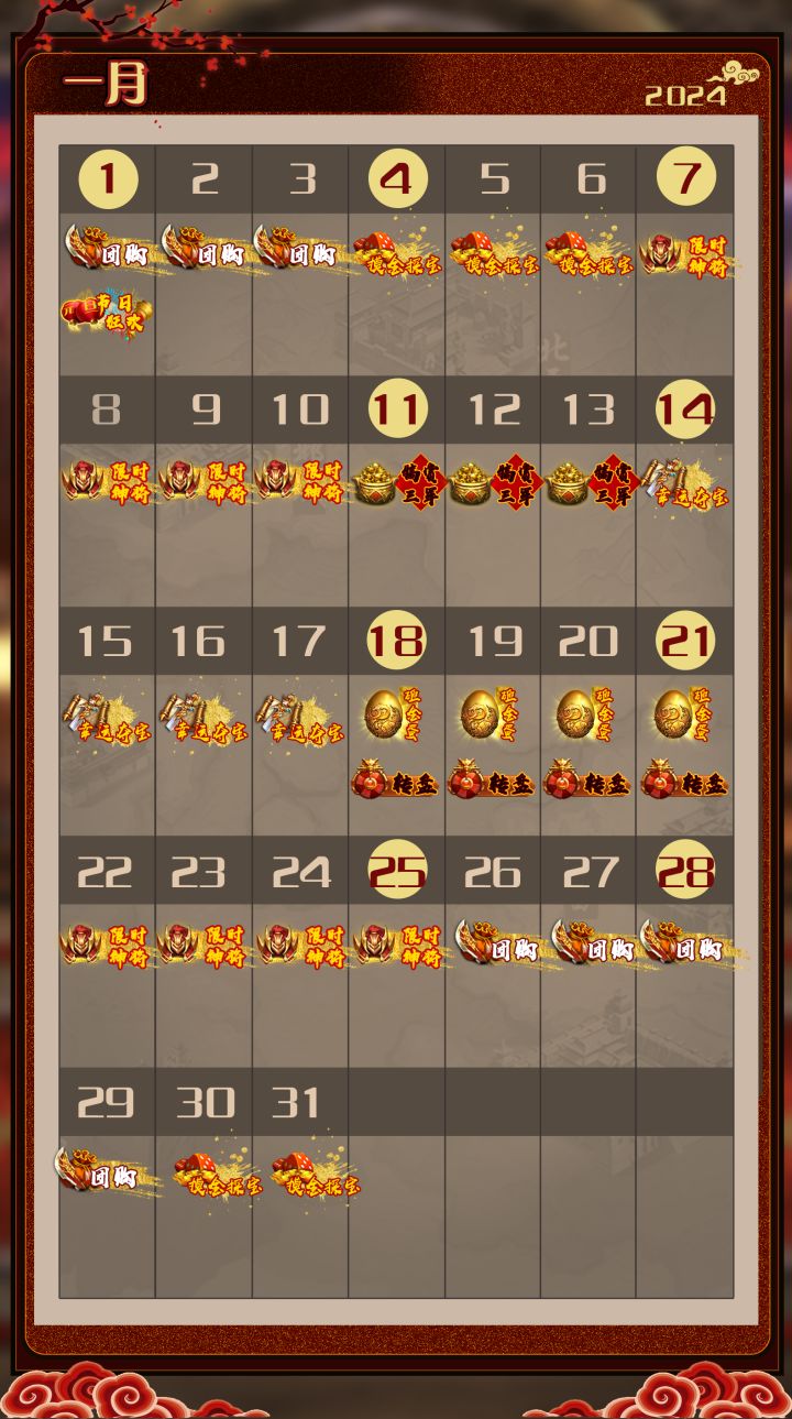 主公好,2月的活动日历新鲜出炉咯~🌸本月会有两次节日活动——春节活动可以兑换无双金将,元宵活动则是乱世金将,另外限时神将活动也可以兑换这两种金将,主公注意安排武将获取的时间哦。祝愿主公早日获得心仪金将!!#游戏资讯#活动日历#群英之战
