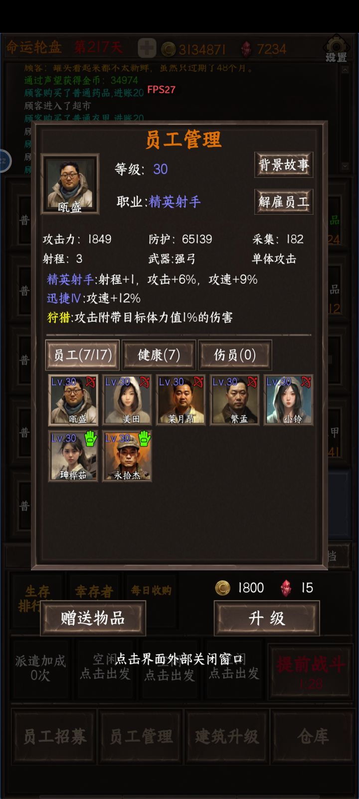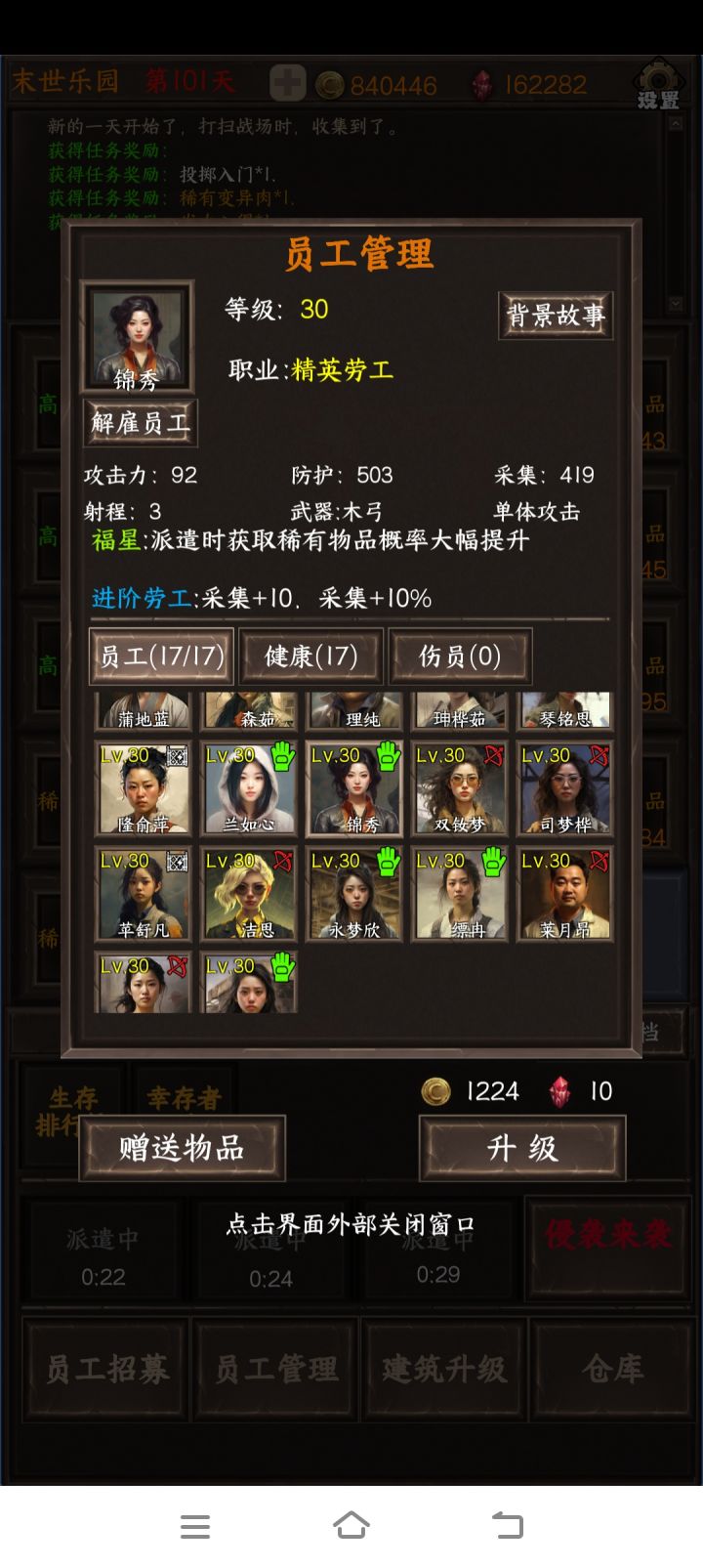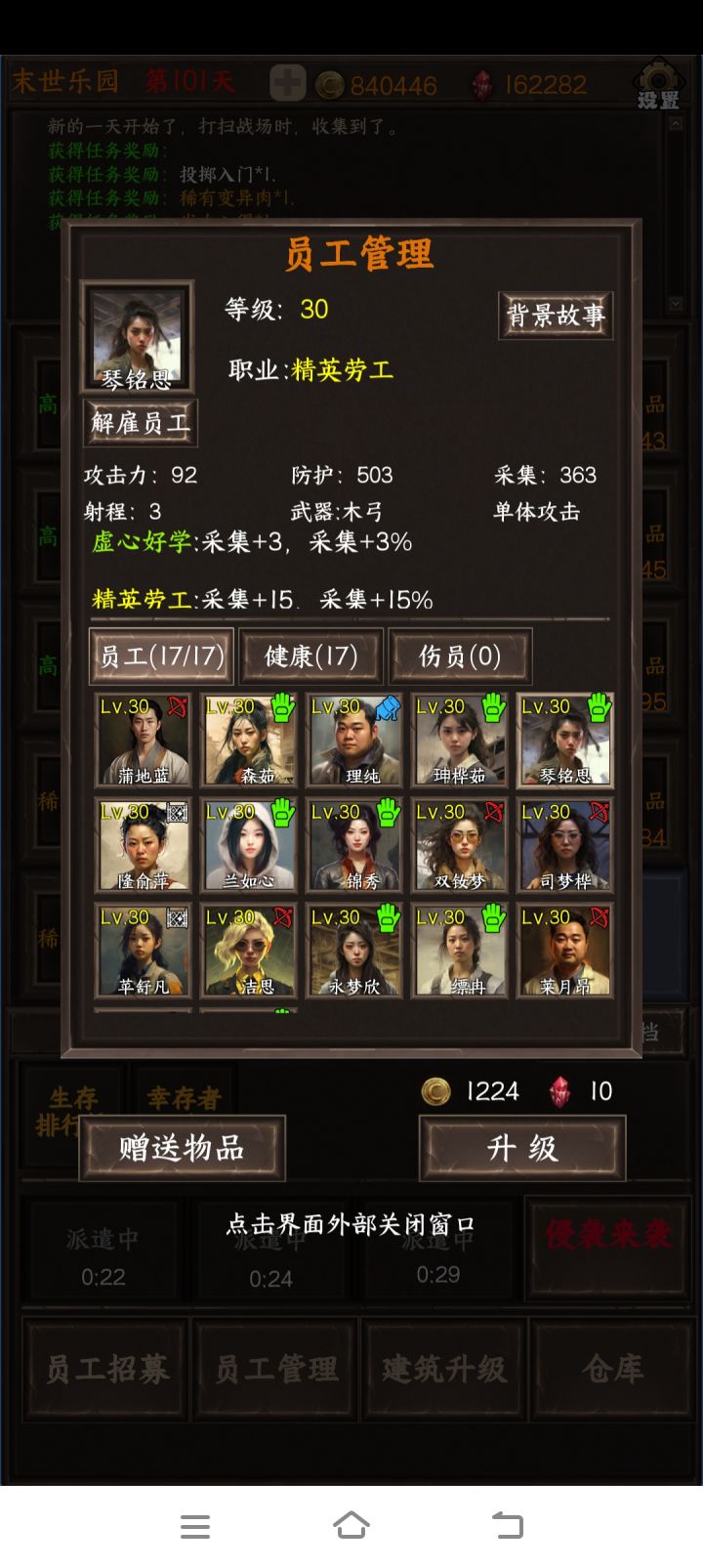 到今日已经生存第47天存储声望30068严寒终于过了,不过现在食物药品短缺需要加急生产采集未来几天雾雨天气频发,污染度较高,请做好防护(每日第一次分享送380金币。)