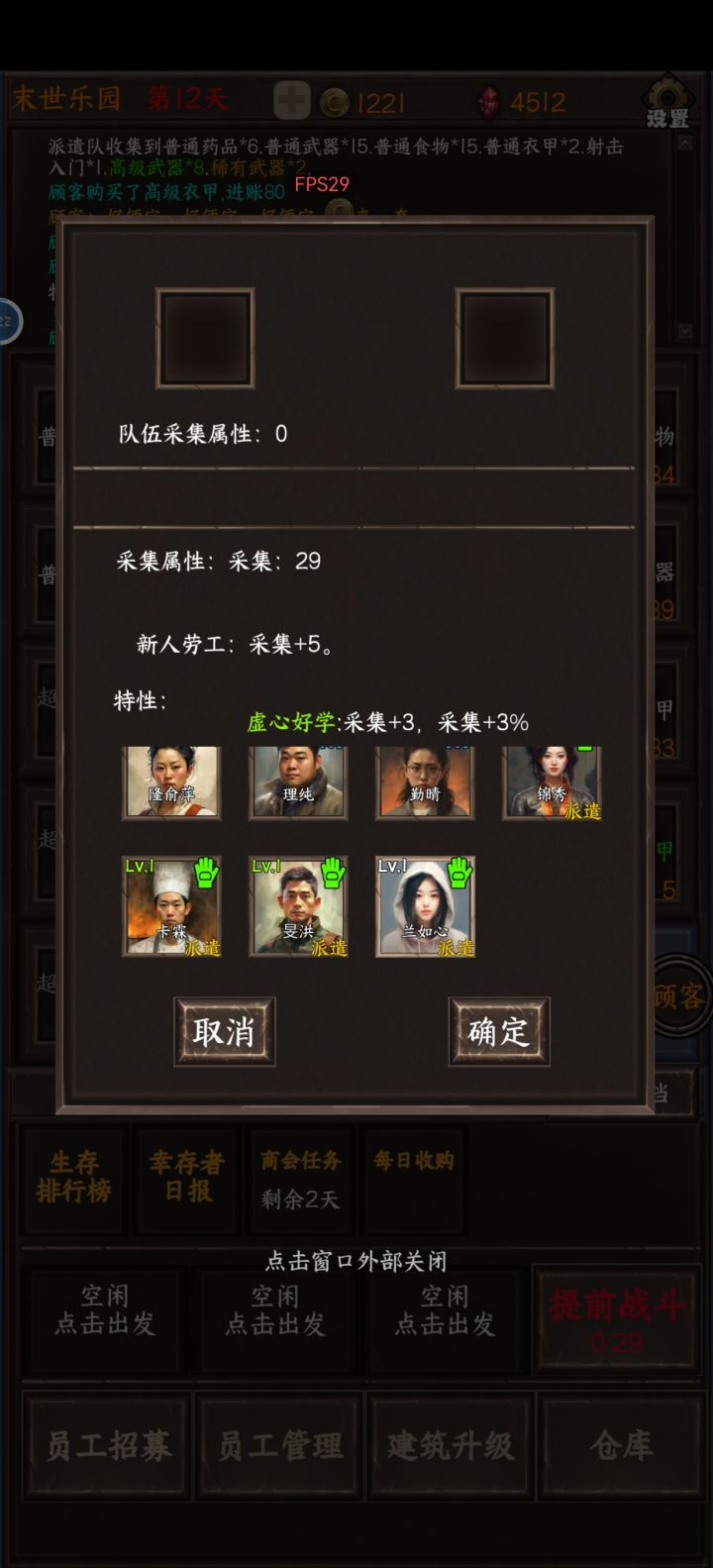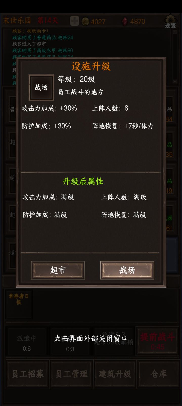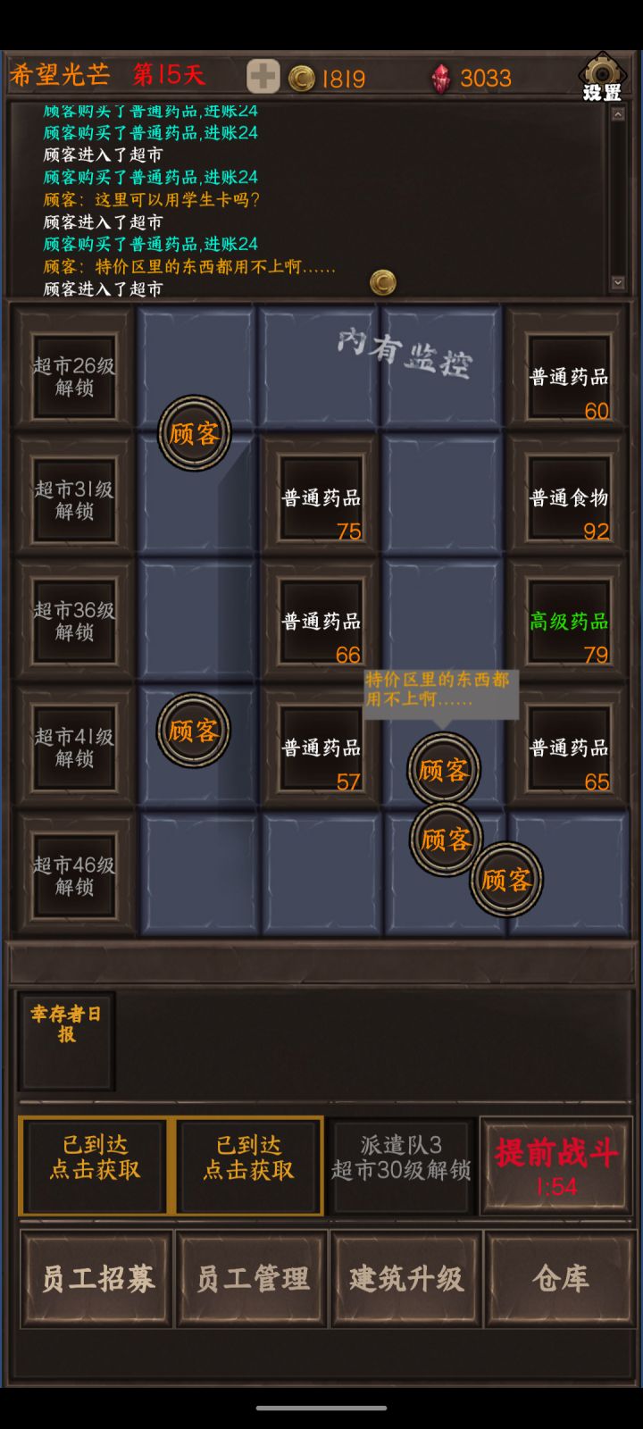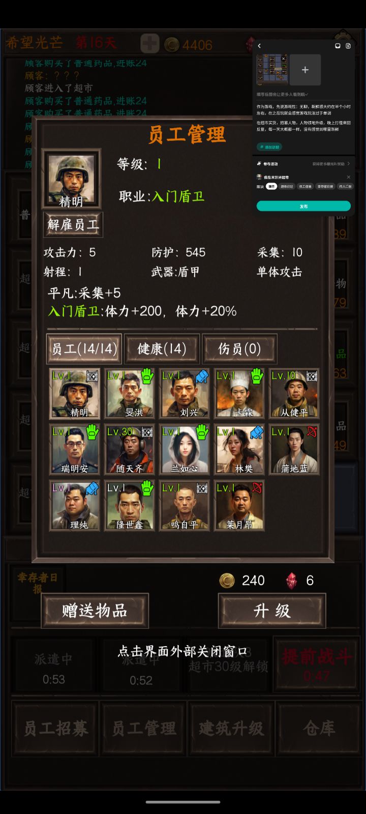 作为游戏,先说游戏性:无聊,新鲜感大约在半个小时左右,在之后玩就会感觉游戏玩法过于单调在超市买货,招募人物,人物领地升级,晚上打怪来回反复,每一天大概都一样,没有感觉到哪里新鲜人物类型只有四种,前排,射手,群攻手,采集(人物天赋磁条也没有很多样,让人没有想看广告刷新的想法)每天晚上的尸潮,你只要养好了前排和群攻手,就完全能过,甚至不需要每天晚上的buff加成,弓箭手单体过于拉胯,不知道存在的意