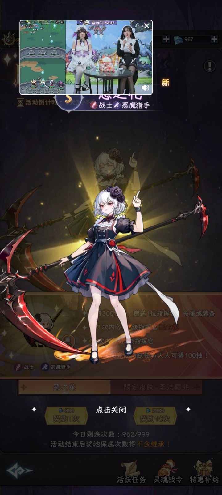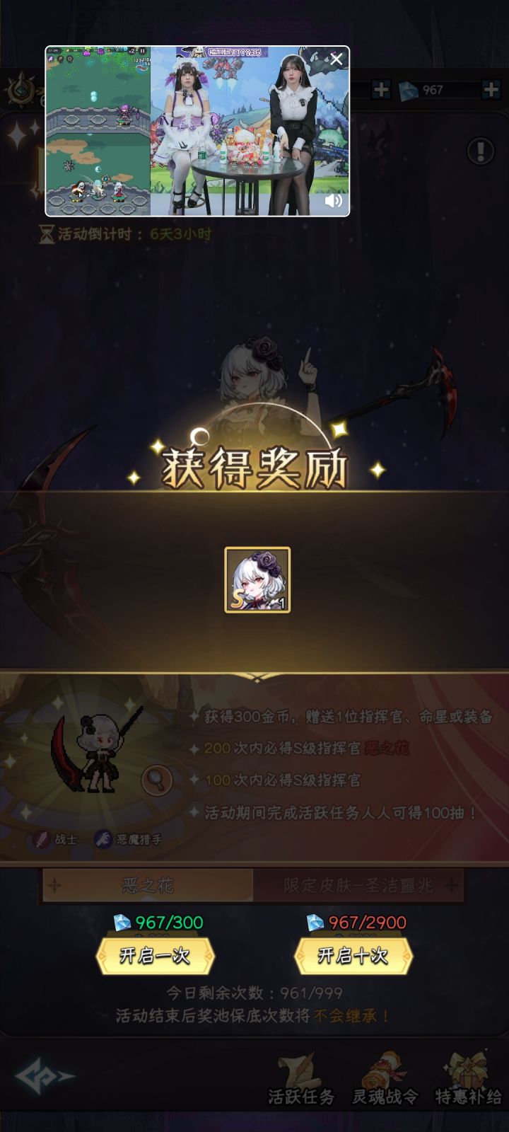 那边看着直播爆料,这边发现验证码送了5个金钥匙,想着又能去新区刷开局了,前面刷的号脸黑一时越想越气就想把钻石浪完去新区重开,结果!剩1000钻左右!点了一下单抽!居然出了!真的是惊喜啊,猝不及防地就冲脸来了