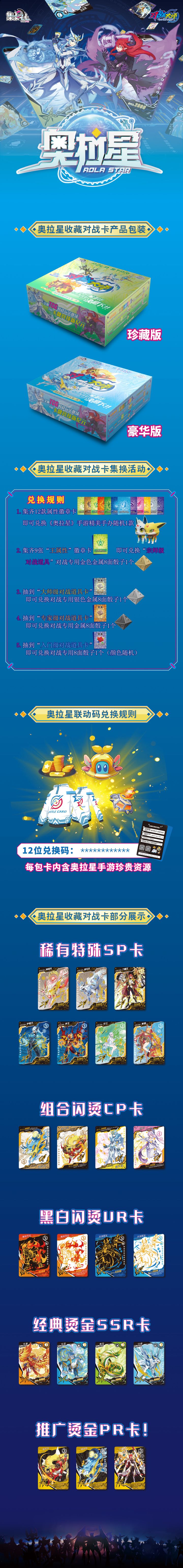 各位亲爱的小奥拉们:由《奥拉星》手游授权杰森动漫所推出的官方正版实体对战卡来啦!诸多明星亚比将在你的生活中实现“现实PK”;不同包装的卡片也将各具独特的收藏价值!请小奥拉们认准官方logo&防伪标志具体防伪识别方法以及正版实体对战卡详情可以点击图片查看~特别说明:这里面是有本宝宝的!本宝宝可是……闪……卡(不是SSR重要吗?)!(*^▽^*)