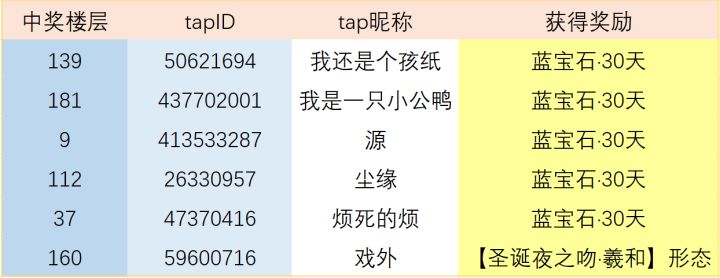 中奖名单:冰雪平安夜活动中奖名单 - TapTaphttps://www.taptap.cn/topic/22082696?share_id=456373789834&utm_medium=share&utm_source=copylink【活动时间】2022年12月23日~2022年12月26日 22:00【活动奖励】随机抽取5位小伙伴,获得蓝宝石(30天)*1随机抽取1位小伙伴,