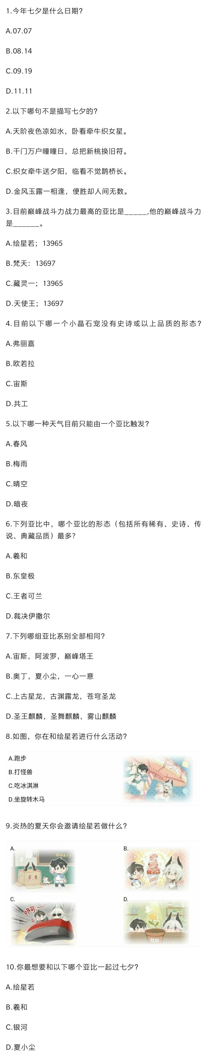 浪漫七夕,梦幻来袭!在这样特殊的日子里,小奥拉们此时有没有和自己喜欢的人在一起度过这美妙的时光呢?这个七夕,绘星若将与你一起度过,这边准备了10道题,快去参与答题挑战,赢取绘星若手中的礼物吧!【活动时间】2021年8月14日发布起—2021年8月15日21:00结束【活动奖励】在所有答对至少7条的楼层数随机抽取10名,每人可获得蓝宝石(30天)*1【参与方式】回答所给的所有10条选择题