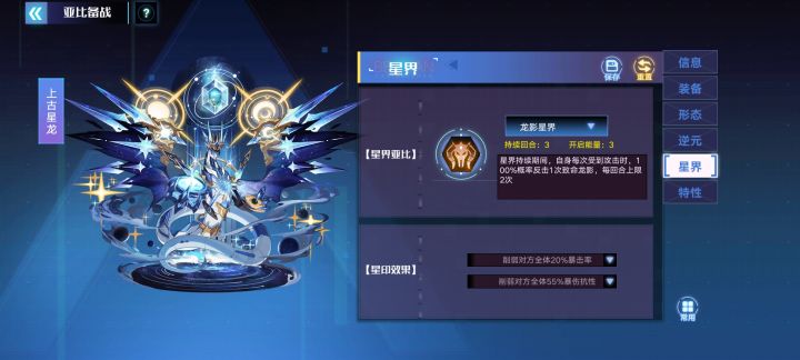 星龙龙影星界的3个BUG第一,星界持续回合与描述不符,技能描述为3回合,实际只持续2回合第二,星界触发的反击一技能,只能削抗性,不能吸抗性,且在削抗的持续回合内,主动使用一技能也无法对该目标进行吸取抗性第三,星界反击的一技能的主动吸血效果目标错误,被吸取体力的目标为星龙自身