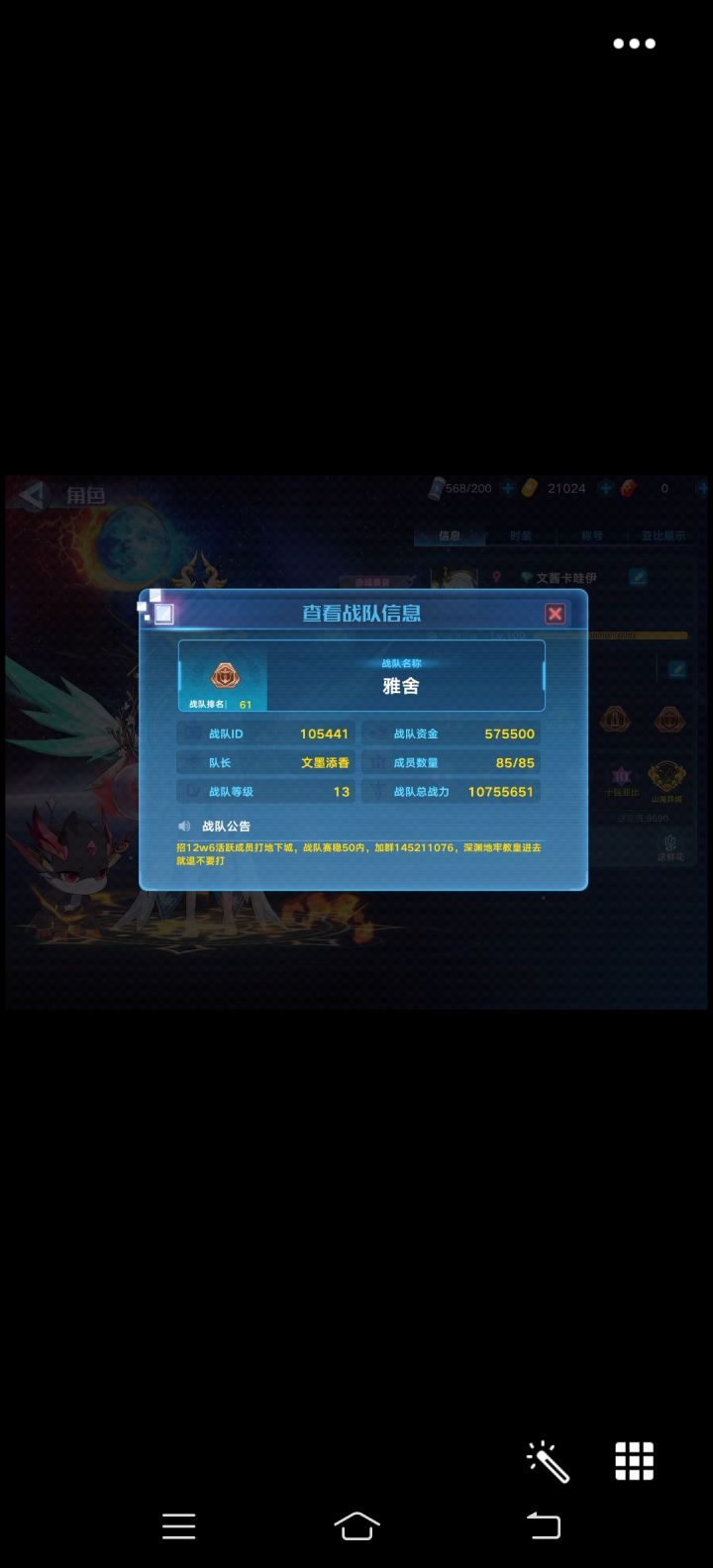 13级雅舍收12.6w活跃玩家,每周五开地下城,战队赛稳定前四十内,有战队小铜牌,气氛和谐有妹妹,有,望大佬都来看看,来了就是家人