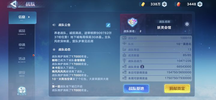 妖灵会馆战队是奥拉星的老牌战队,实力雄厚,常居战队排行前三。队员团结友爱,战队活动积极活跃,取得了决战长安第二名的好成绩🥈队内PVP、PVE大佬都有,游戏攻略都会及时分享。福利多多,大额红包,不定期掉落😉妖灵也是风吹大家庭的一员,主队:风吹深林雾,三队:甜,四队:鬼面舟。盟队:岁寒见后凋由于奥拉星战力调整,现诚招活跃满战玩家~名额有限,速来哦!要求:晶石宠都有且全部满战,超进化可兰,神武月,夜