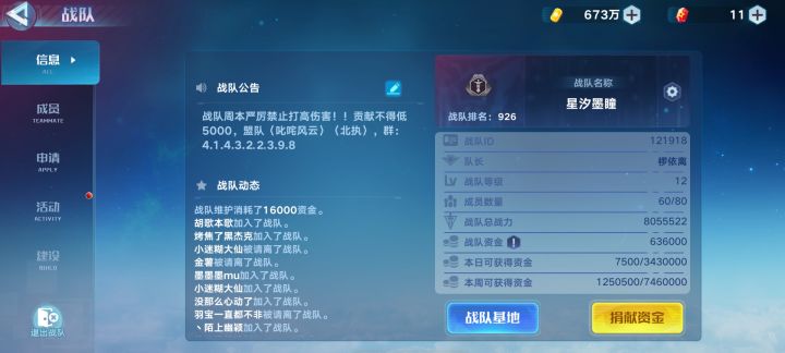 12级活跃战队收人要求战力12万5贡献5000战队副本要求压伤害要留到周末才能打完有要来的加下战队群