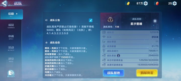 活跃战队收人要求12万5贡献5000周一到周五战队副本不要打高伤害不要扫荡进去就退或者1级星诺打一下就退留到周六周日在打完有要加战队的可以加下战队群