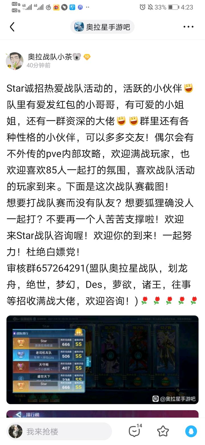 没啥文案,抄小茶的6届战队赛1丶3丶3丶6丶1丶1(两次第三就是菜,没借口),下两版本也是保十休息了,暂时不会冲第一1丶主要是活跃,战队赛是顺便的,其实达到最低要求就行,当然有大佬一起打最好了,那边要求60w+,但如果真的平常很活跃,50w+就行,差一点可以私我的2丶如果离Star标准差很多,但十强能过12.8,梦之队也可以去的,也是下面审核群,Star的一个女管理在带梦之队,首先肯定不会特