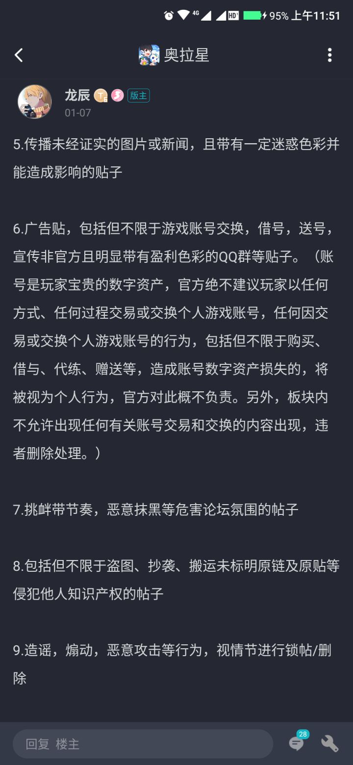 近日奥拉星论坛热度持续上涨,为了维护小奥拉的使用体验,版主团队特设此帖,欢迎奥拉们按要求申请删帖/锁帖。PS.对于符合但不限于下列情况的,可以申请删帖/锁帖:1.涉黄(包括但不限于无意义开车贴),攻击(包括但不限于侮辱诽谤他人或诋毁奥拉星以及奥拉玩家),钓鱼,广告(包括主题贴内非奥拉星内容的图片,文字,链接,水印),嘲讽,爆粗类帖子。2.涉及脚本外挂内容﹑步骤,涉及非正版,涉及其他平台的违规