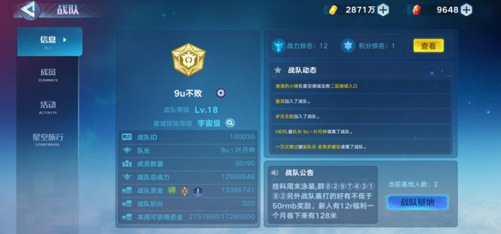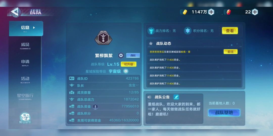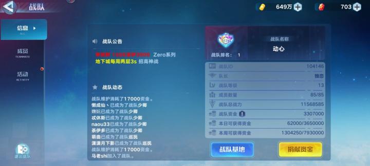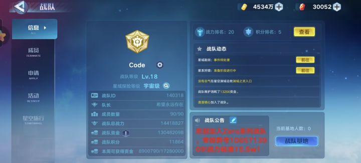 随着周年庆的到来本战队的老玩家也陆续回归,现诚招各阶段玩家共同游玩。①动心简介:动心21年收入系列并在同年拿下战力榜前三高光,现排名9,战队活跃第1,积极冲榜,本期虫洞还拿下了第五的优越成绩。要求:十强满战,积极活跃,配合战队冲榜,跟的上当前及后续版本进度福利:大佬指导、有时会举办活动,队长及部分管理出钱用于活动奖励②Code简介:Code19年建立的分队 ,长期养老,现排名25,目标稳住银标,恢