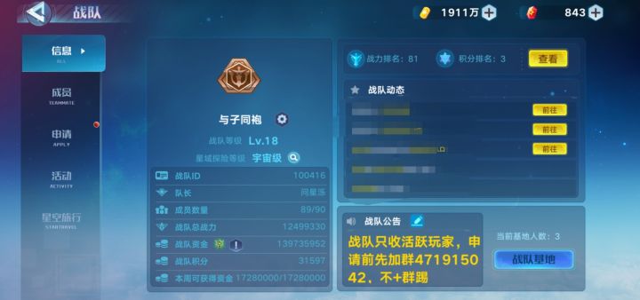 18级活跃战队《与子同袍》招人,每周狩猎打满,10级任务批文终端,星空币商店每周可兑换3个盲盒币,目前多个空位。招人要求:①周末有空按时参与狩猎;②每月底版本活动一般有一次战队赛,为期一周,要求积极参加;③积极参与星空塔,每周打满次数;④十强最低13.9w,可根据活跃程度降低战力要求。有意者请直接加群审核471915042,帖下回复不一定能及时看到。