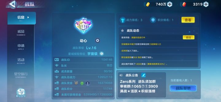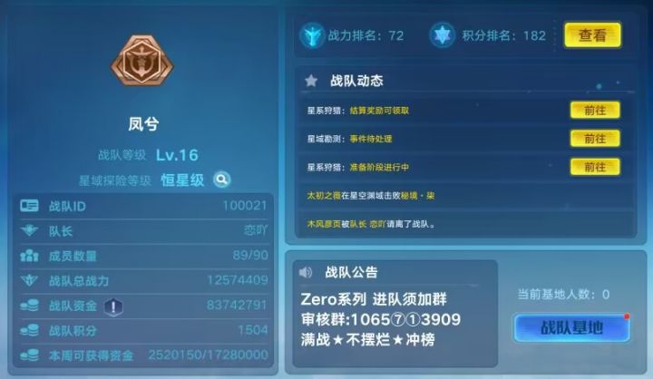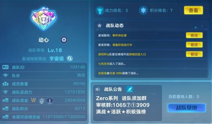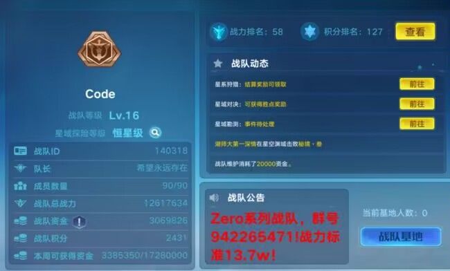 战队介绍:动心 招活跃满战 每周积极参与战队内活动(渊域&狩猎)积极拿榜 目前战队两个榜基本都能稳前十前三 每月战队赛也能前十Zero 招满战养老 佛系活动 极限摆烂 战队战力榜金牌 老牌战队 争取回归前十凤兮 招高战活跃 战队活动和一些战队赛需要积极打 争取两个榜都金牌Code 招13.8w养老 平时佛系养老 可以随时进其他战队搞活动 前百战队战队历史: Zero&Code是开荒战队