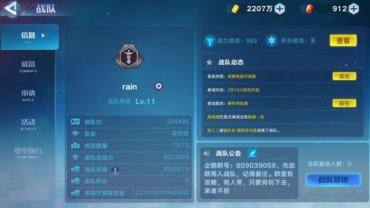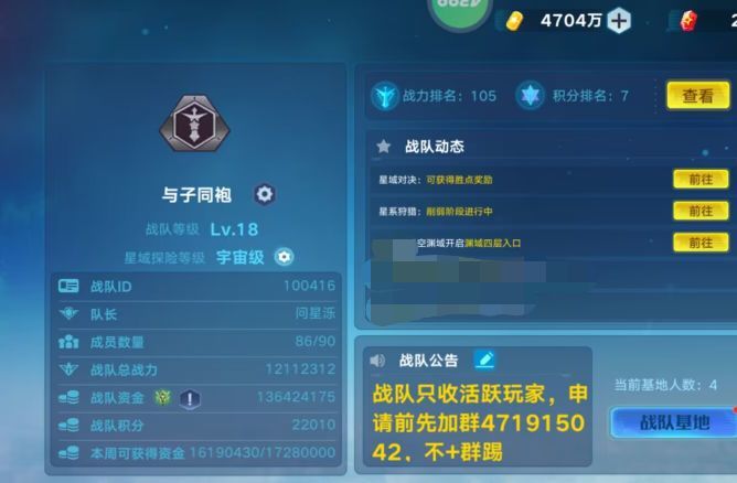 目前11级老战队急需新队员,欢迎各位的加入!记得先入群后入战队!以便好交流!需要常驻玩家(一个星期能玩一两天就行,有事的话可以请假),记得积极做战队任务!我们战队不追求排名(但是如果有战队活动也希望各位能够积极参与,活动结束战队队员同样也有排名奖励发放的),只希望能够聚集一些拥有共同游戏爱好的朋友。群内有问必答,来了就是一家人,你若不嫌弃,便欢迎到来。