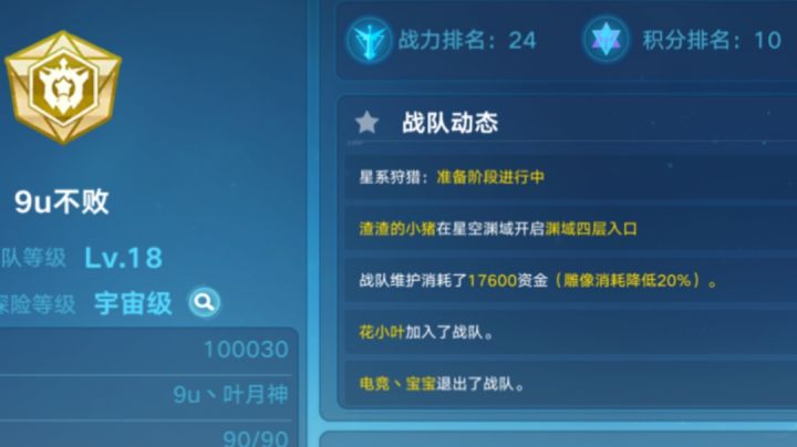 ①9u收十强14.1w,神宠150w及以上【有小黑或孔雀可降门槛】的高质量玩家,最好会打各种战队活动(战队赛,星海航行等等).②打9u收十强14w,神宠80w及以上的高活跃玩家,越活跃越好(等你符合9u条件可去9u,也可继续呆打9u).③调整战队贡献激励,两战队(9u与打9u)同算,第一98,第二68,第三30,第四和第五12(每人每月上限128,特殊情况除外【解释权归队长所有】)