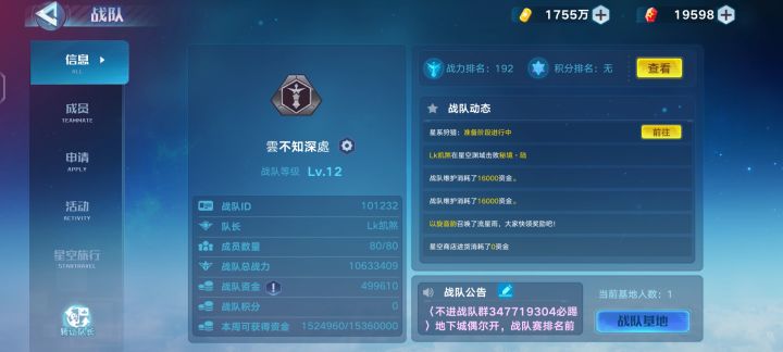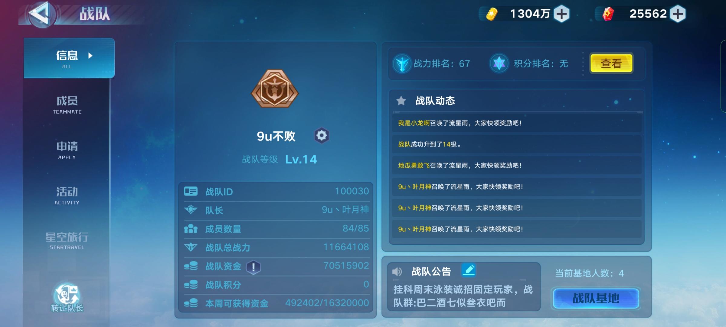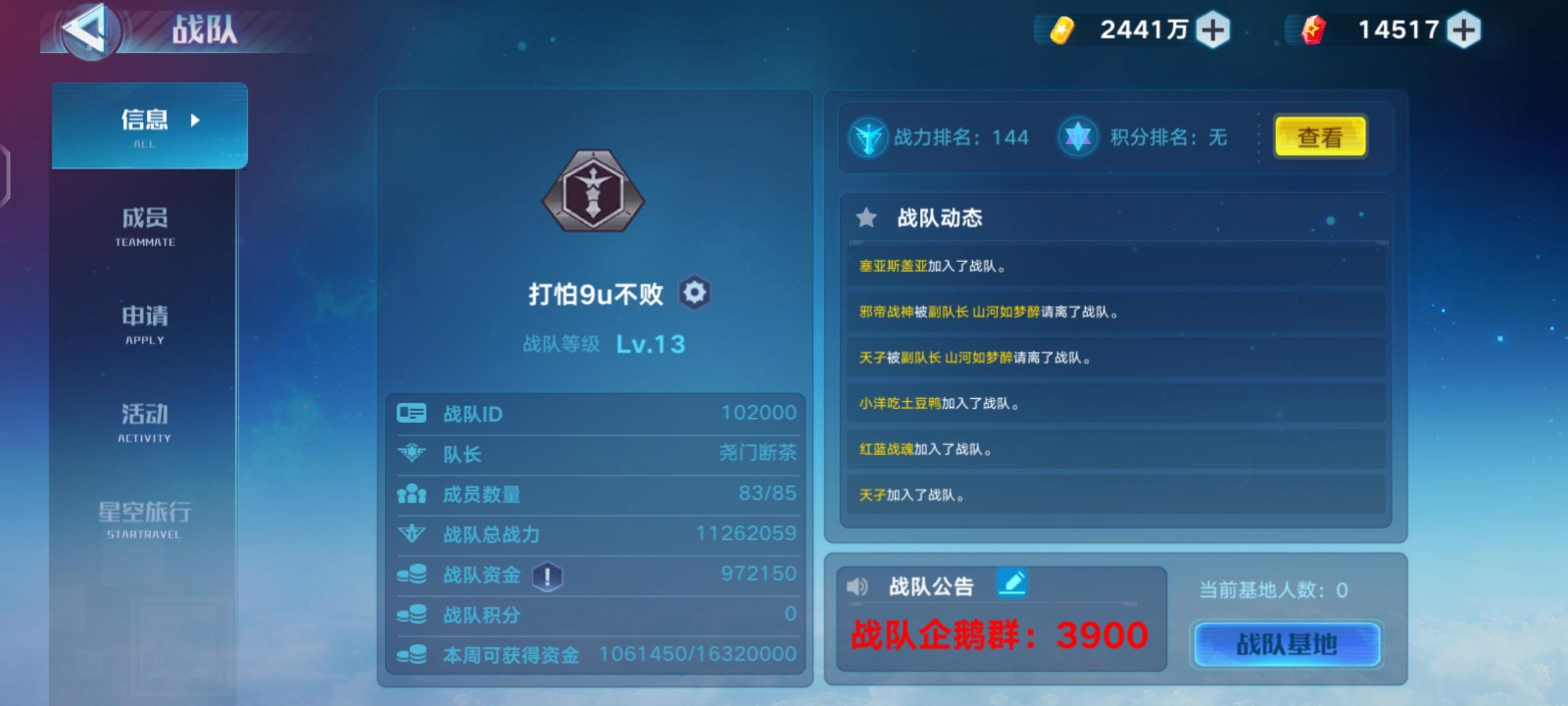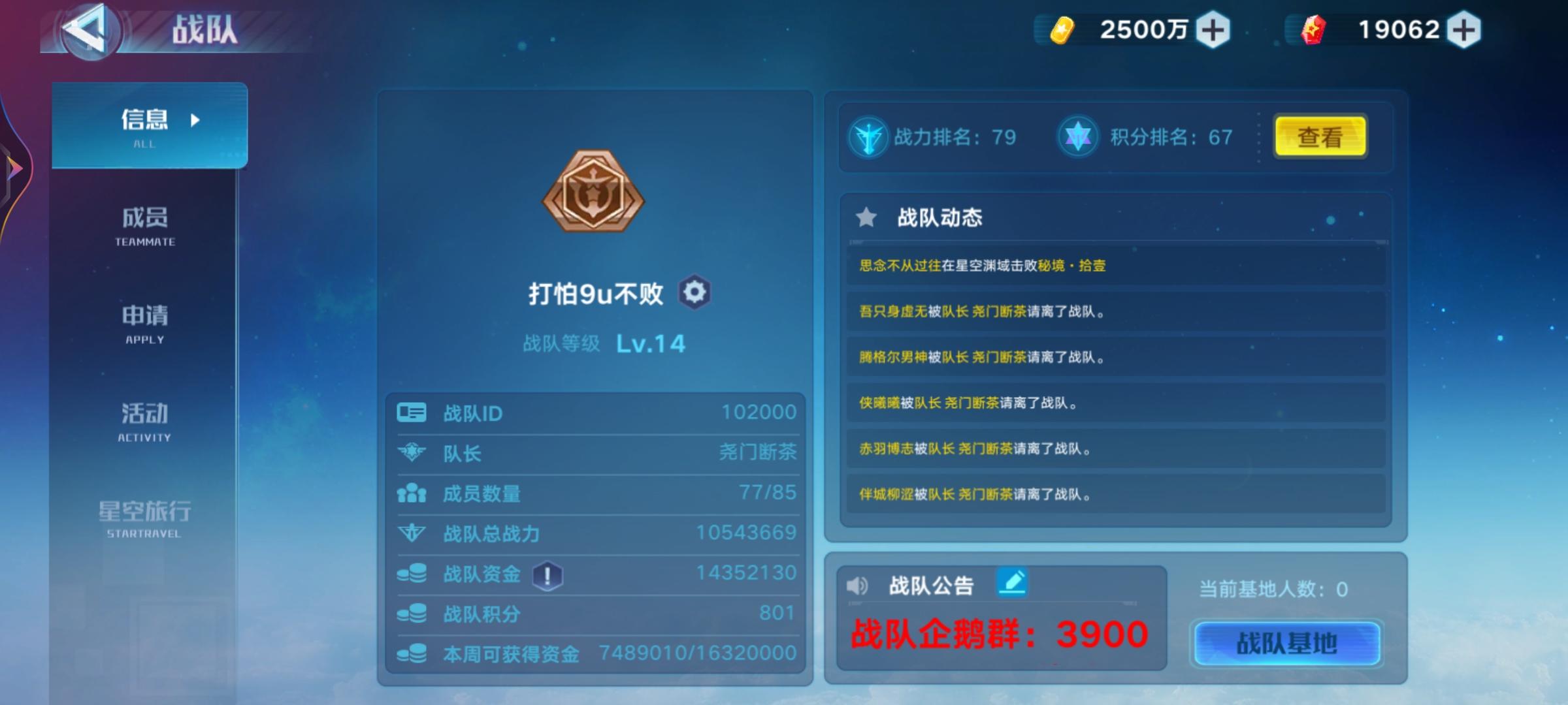 刚刚清了一波人,现在又有好多位置了,我们收十强13w7的活跃玩家,我们战队也是非常活跃的(看图,战力排名是满人时的排名)😋 有没有带佬还没有战队的快来,群里更是非常的活跃(7天2w条消息)😍