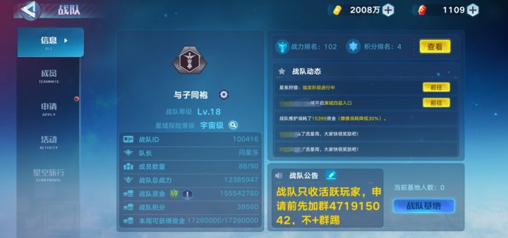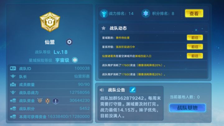仙盟长期招人(双榜前15),要求:14.15W战以上的狩猎渊域都玩的活跃玩家,战队群活跃气氛好,没有那么多条条框框,万事都可以商量着来,以战队队员为主!战队没有系列,也不愿做系列的旺财,游戏嘛开心最重要!内部都有最新活动攻略,一起变强!仙盟欢迎各位的到来!有意者进群聊!