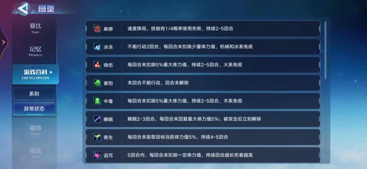 此贴是写给战队里新人们看的 有指证意见欢迎提出补充1. 亚比篇(1)异常状态异常状态为亚比使用技能时(概率/必定)出现的向敌方附着的状态这里拿白皇举例:【专属特性】寒冬霸主:每次攻击获得1层印记并50%概率令目标溺水,当印记为6层时攻击溺水目标消耗6层印记令目标冰冻永冻【冰】物理永冻剑气攻击敌方单体,扣除自身1点能量命中后扣除目标1点能量并100%概率冰封目标2回合这里可以看出异