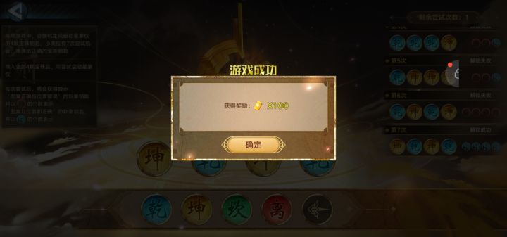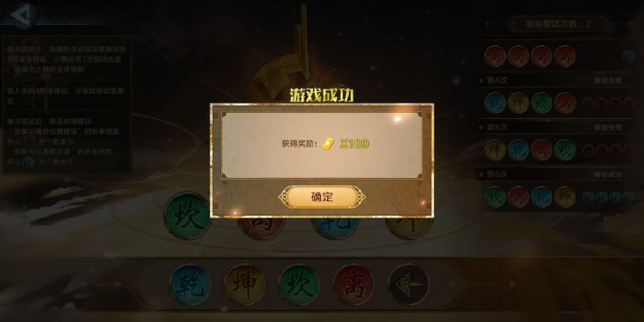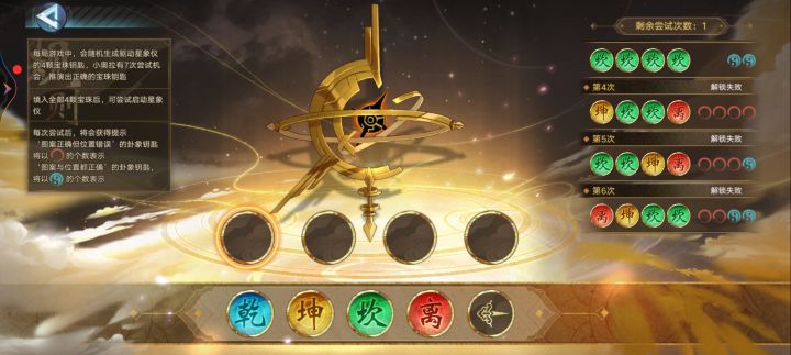 浅谈一下这个乾坤砍离的玩法,我目前是3/5,前两次不知道有重复这个东西哈,后来才知道,首先你要有四个图标出现,不管是圈或者是绿点,至少证明你字是对的,然后你再把他们按照排列组合的方法搞几组试错,如果你搞出四个红圈基本上稳了,可以排查很多组合,然后后面只能靠自己小学学的推理法,他不能在这在这,所以,他只能在这😂😂😂最后补充一下,也有可能出现四个一样的,很阴间