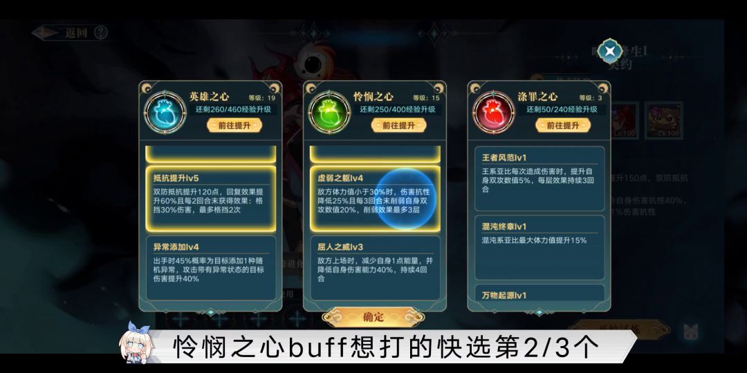英雄之心buff全选 怜悯之心buff想打的快选第2/3个 抗不住就选第1/4个buff 如果打不过,就去升级buff然后再回来打 没有麒麟的去战队终端那里借一个