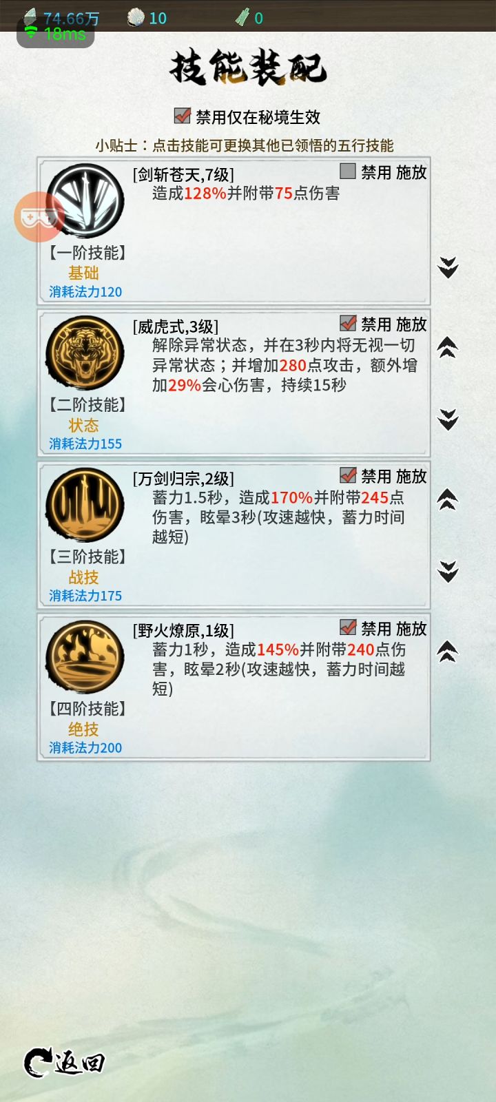 山海试炼游戏内技能搭配:1.挂机篇游戏内挂机经验跟杀怪效率成正比,为了提高经验获取效率我们除了提升攻击属性,反弹属性这些以外技能搭配也很重要。比如作者玩的金灵根,威虎式加状态,万剑归宗和野火燎原需要蓄力技能伤害倍率也不是很高,所以这些技能都不适用于挂机,可以选择禁用如图:其他属性灵根也差不多,状态技能和需要蓄力的伤害技能都不适用于挂机。2.PVE篇游戏内技能自由度非常高可以学习其他职业技
