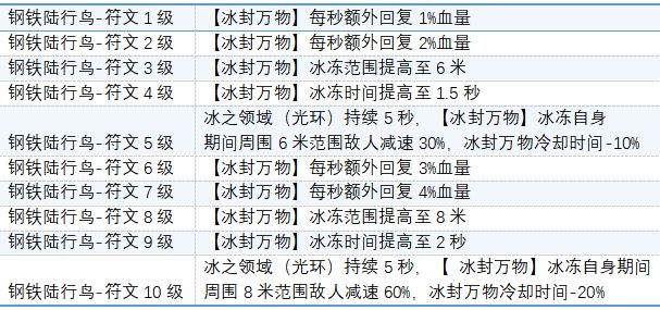 先行服开服也快一个月了,我们的陆行鸟也是如期而至上线先行服。接下来就由我来给大家分享一下我自己对陆行鸟的独特理解以及今后的养成路线和即将上线的符文系统。钢铁陆行鸟技能【冰封万物】冰冻自己4秒每秒回复自身10%血量,同时获得免疫控制效果同时对5米半径内的敌人造成伤害并且冰冻敌人一秒。搭配上专属10级符文强化,技能也是得到了史诗级的增强,技能每秒生命回复变成14%,技能范8米半径,且对范围内的敌人