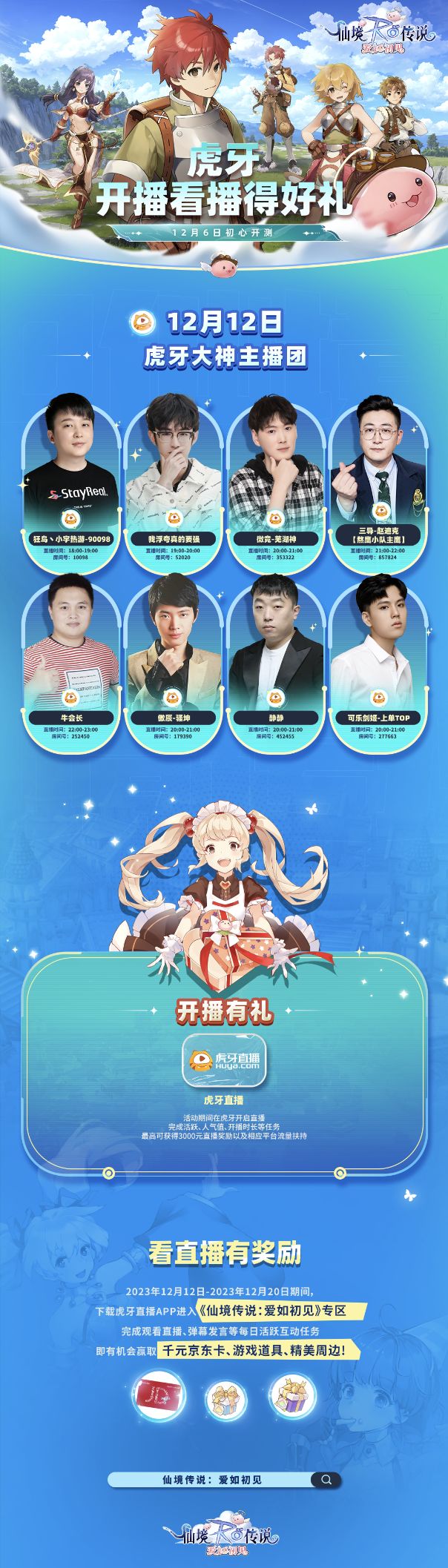 各位初心者好呀,再见如初,就是RO!《仙境传说:爱如初见》「初心测试」现已正式开启!「初心测试」虎牙主播招募限时开启!参与开播将可瓜分万元京东卡!看直播也可瓜分大奖!虎牙开直播瓜分万元大奖活动期间前往虎牙平台报名,报名成功后,完成相应直播任务即可瓜分万元大奖。活动时间:12月11日—12月20日官方QQ1群:687772337微信公众号:仙境传说RO爱如初见游戏官网:苹果App#仙境传说爱如初见
