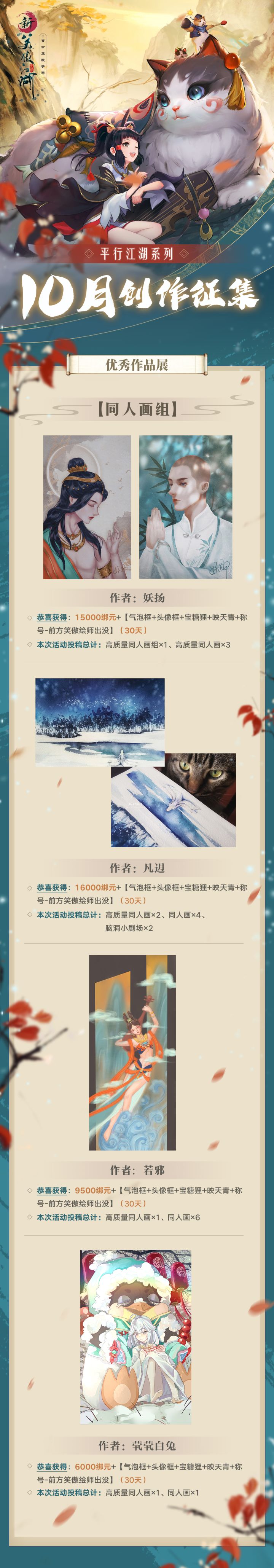10月优秀作品来啦!!为鼓励少侠创作更多优质作品,每月的优秀同人作品都会进行获奖公示(微博、公众号、B动态、Tap社区)~ 这样就可以让大家优秀的作品被更多人看到啦!更多平行江湖精彩作品指路→https://xxa.wanmei.com/tongrenzhan/【重磅】平行江湖11月大型同人活动即将揭晓!神秘大咖担任评委、万元级奖励池来袭!详情于11月12日(明日)公布!大大们可以准备起来