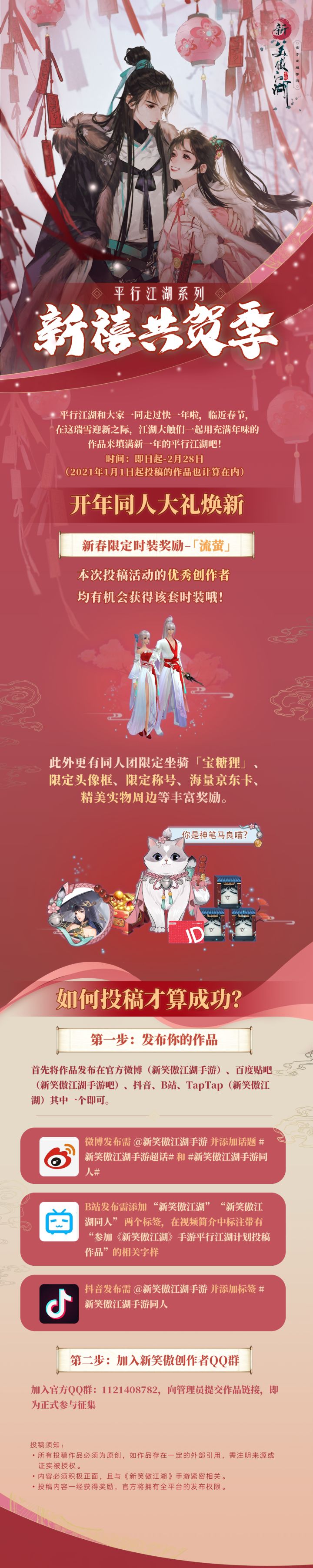 “巧裁幡胜试新罗,画彩描金作闹蛾。”《新笑傲江湖》手游平行江湖计划——“新禧共贺季”春节同人征集活动欢乐开幕!2021已经过去19天啦,平行江湖计划也迎来了2021年的第一个活动——新春佳节主题同人征集!各路江湖大触,快来用你们“充满年味”的作品,一起来创造属于大家的“新春版”平行江湖吧❀春节同人限定奖励❀本次活动的优秀创作者将有机会获得喜气满满的精美时装「流萤」哦!(仅限本次活动)❀活