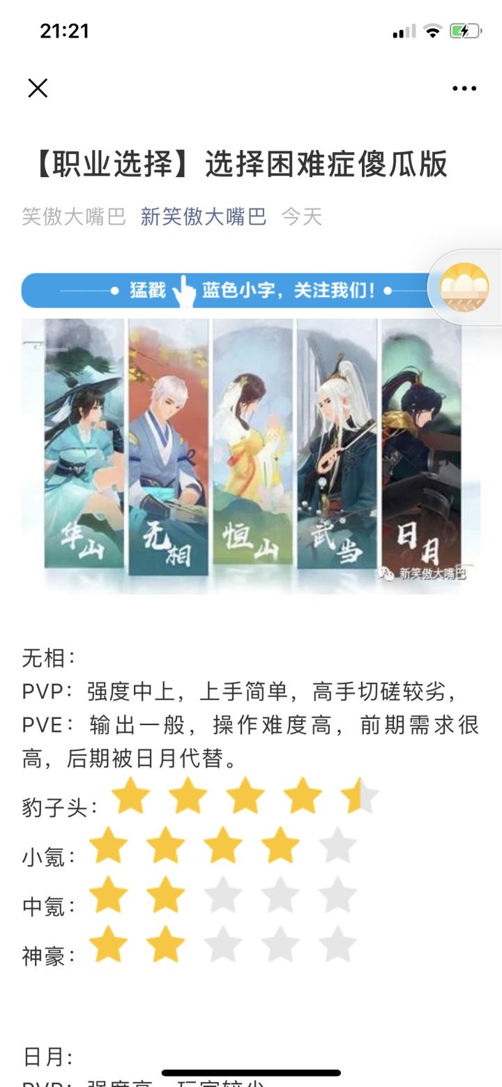 文章选自公众号;新笑傲大嘴巴无相:PVP:强度中上,上手简单,高手切磋较劣,PVE:输出一般,操作难度高,前期需求很高,后期被日月代替。豹子头:🌟🌟🌟🌟🌟小氪:🌟🌟🌟🌟中氪:🌟🌟神豪:🌟🌟日月:PVP:强度高,玩家较少,PVE:可坦可输出,操作难度一般,后期副本需求高。豹子头:🌟🌟小氪:🌟🌟🌟🌟中氪:🌟🌟🌟🌟🌟神豪:🌟🌟🌟武当:PVP:强度高,操作难度低,玩家众多,