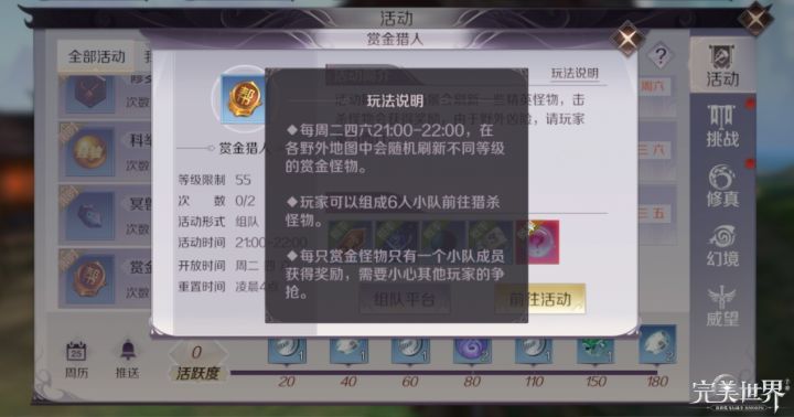 野外狩猎特种BOSS,赏金猎人玩法介绍最近完美世界中有上线了许多新的活动,其中赏金猎人活动引起了大家的广泛关注,那么本次我们就对这个活动进行介绍,帮助大家成为一名合格的赏金猎人。赏金猎人活动在每周的二、四、六三天的21:00~22:00开启,在活动开启之后,规定时间段内会在野外刷新出不同等级的怪物,如果小伙伴们比较细心地话,会发现这些怪物都是我们曾经刷过的副本中的boss,在技能设置上也没有太