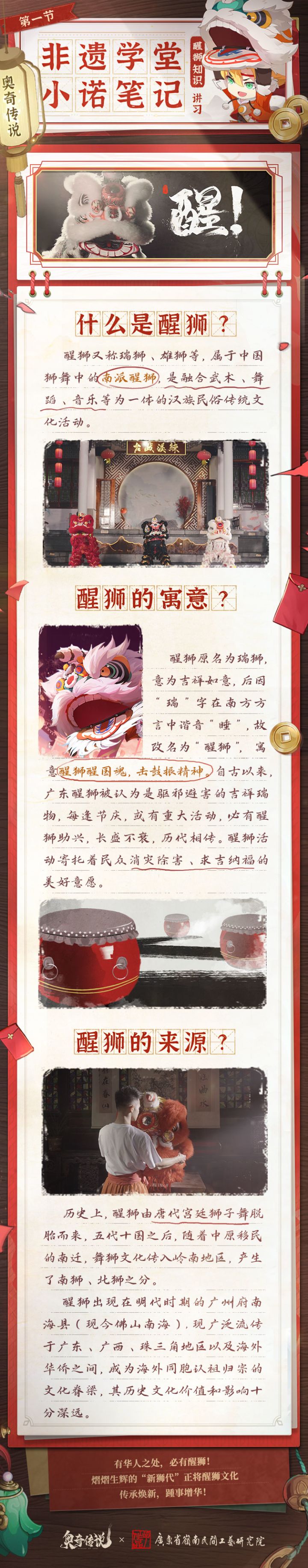 大鼓声起,雄狮腾跃 神威尽显,破壁而来 奥奇传说x广东省岭南民间工艺研究院跨界联动即将开启! 1月20日 「醒狮舞春」联动版本震撼上线,让我们先来一睹醒狮掠影吧!