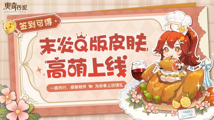 一整天都没有看到末炎的身影还没有进门却闻到了令人垂涎的香味色泽晶莹的巨大烤鸡摆在餐桌中央忙了很久的末炎正满意地看着自己的大作“你来了?那就先把餐具摆放好吧!”感谢一路上奥奇们的支持与陪伴这是一份送给奥奇们的礼物希望奥奇们能喜欢让我们一起走下去吧~新皮肤「鸡腿自由·小末」将于11月18日上线,签到即可免费获取!敬请期待~
