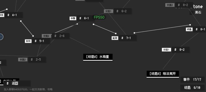 结局7:6-1直接调出奇诺咖啡交给wzi的朋友后达成配方:咖啡粉25,巧克力22,牛奶14结局5:3-1研究院钟表调到4点32直接解锁结局9:最终8-1触摸黑石那里选择放弃和离开结局1:最终8-1测试后理智刚好在0与0.2的区间内结局2:最终8-1测试后理智为负数结局3:最终8-1测试后理智为正数,0.3到0.6结局10:扣下扳机的那个时候切换一下意识直到出现松手选项