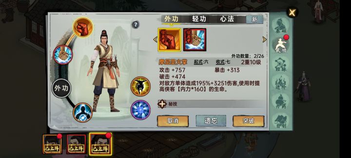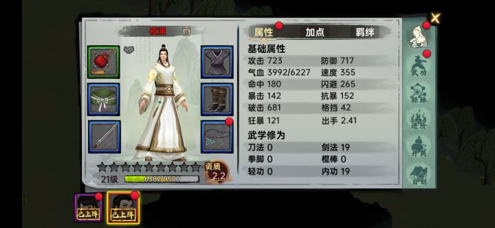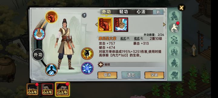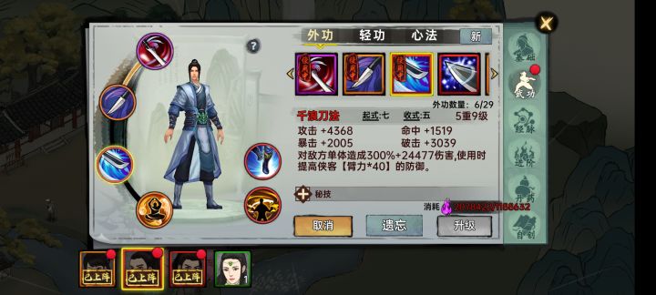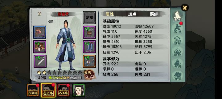 #武侠历险记 成为萌新的第四天,也是看过其他攻略选择了张益禾开局,然后全力养一个。众所周知,这游戏也是很肝的,而我也是在第四天成功的肝到了49级,预计今天也是能到50级,然而刷图快的缺点就是蓝色功法太多,占用背包空间,合成紫色或者更高需要元宝,而元宝又是十分的稀缺,所以我跟纠结是留着等50级合金色功法还是把蓝色功法先合成?由于刷图多,所以靠药品在49级的时侯也是成功的打进了62级的地图,但是