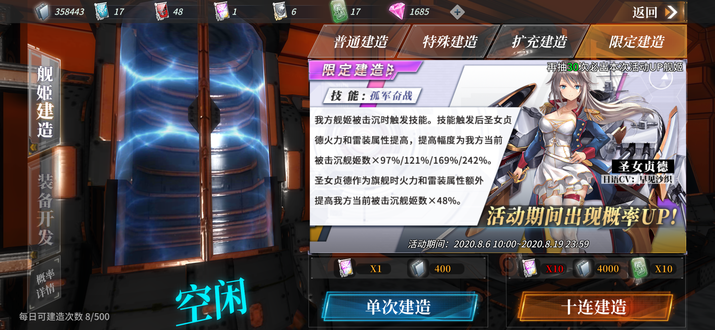 看了下,普通建造没有,特殊建造也没有。。只能限定建造出,而限定建造的图纸只能誓约币造,誓约币又要软妹币才能买到。。。