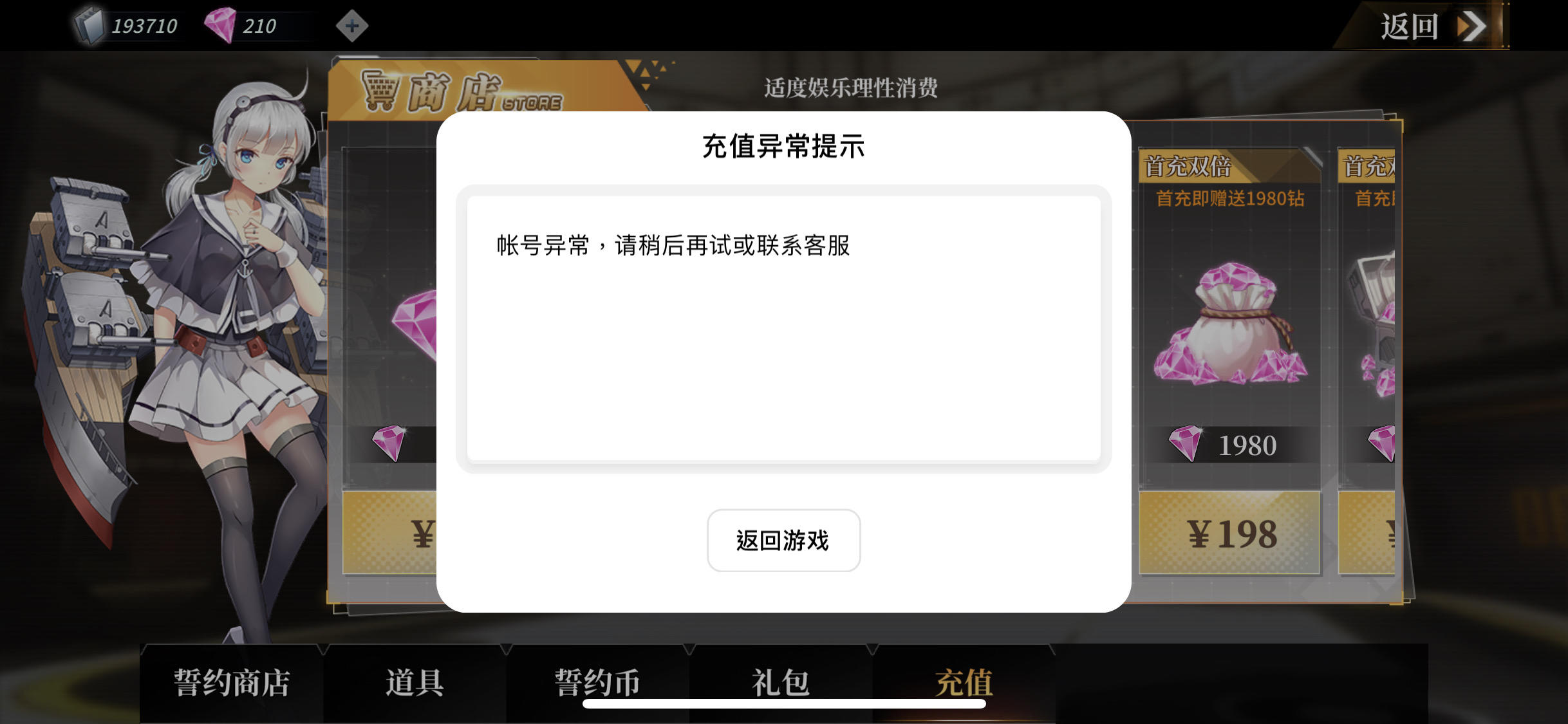 充值提醒我账号异常问题是我只有这一个设备哪有别的地方登陆啊…氪金都氪不了…话说到底啥就算账号异常,说清楚啊