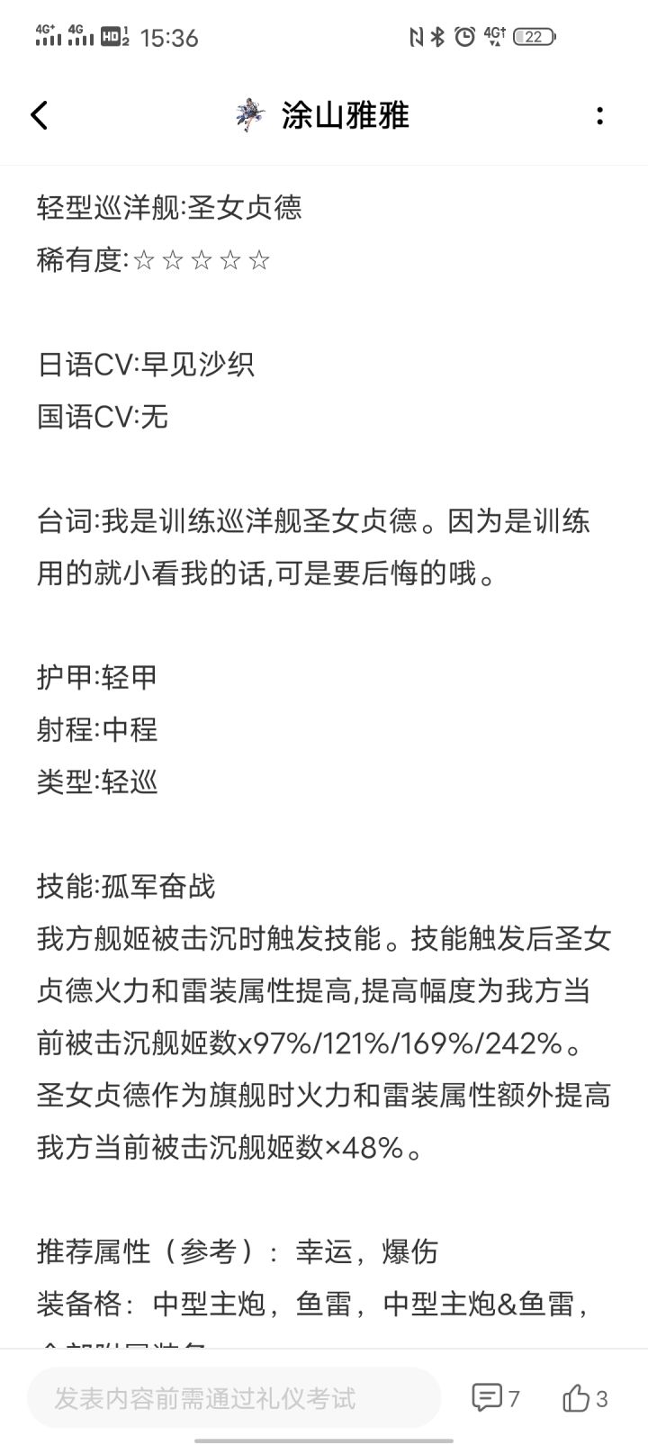 (直接盗图,懒)来说一下即将更新的圣女贞德号的强度吧,这是一艘彻彻底底明明白白的pvp舰娘,装备槽中规中矩,玩雷或者开炮都可以,具体看各位的喜好,pvp推荐的阵容应该是贞德+任意四艘1级驱逐(越容易被击沉越好)+狐尾。或者是贞德+四艘任意的1级驱逐+致远,说到这个顺道再来说下致远把,再脑测数据得出的伤害假设主炮可以造成250的伤害那么,100增效的满技能致远能造成的伤害应该是每艘6000+(具体