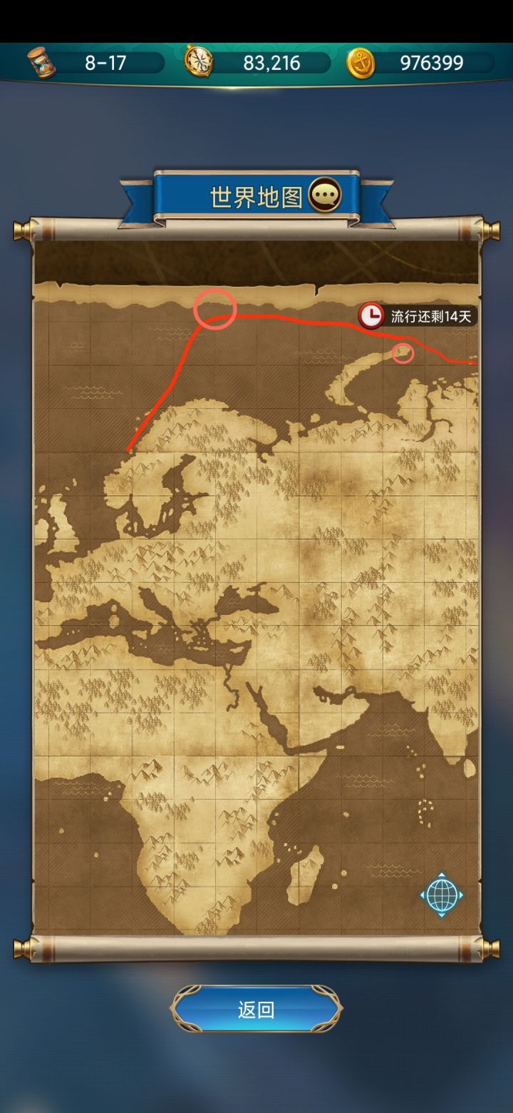 lz做任务到汇合打葡萄牙那里过不去了,于是开始瞎走,无意间找到非常有意思的开局办法,从苏联(靠北极)上方绕到亚洲,如下图:大致如下方位,圈圈是补给位置lz的小船,两艘大飞一艘巨型一艘氪首充顺路买的,全部清仓一次可以跑60天北极没什么好卖,都是冻鱼啥的,不过两级海盗可以掉图纸,可惜楼主打不过,开加速避战按钢丝的地图记忆跑过去的一个捕鲸,一个反捕鲸,居然连一起上图港口会依次经过,最后就到了一