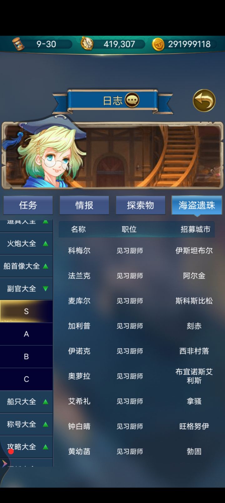 萌新的一点经验,供更新的萌新们参考。1、船速等于所有船只的速度之和。2、大明的所有港口都是买卖免税,所以没必要翻大明的港口。3、攻打海盗的港口不掉国家好感,还能获得战斗声望。4、逆转的沙漏只有自动寻路可以加速。5、港口投资1万元就可以自动保存,避免了等保存冷切的痛苦。6、刷40级副官升级道具的方法:准备升级的港口待到月末最后一天进港,保存,然后出港后1号回港,看黑市,不合适就点存档中的