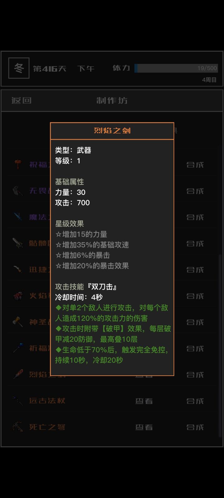 ●这个搭配的核心词条是破甲、技伤、暴击暴伤。 ▪武器融合后破甲层数可达20层减400防御,附魔和淬炼都有无视300防御,束缚控制时会减100防御。一般700~800防御便可以了,怪的初始防御应该也差不多在这个范围,骷髅巨剑还有无视100防御词条,寒冰之弓无视150防御。 ▪技伤:附魔70、淬炼70、天行套0技伤/智者套15技伤/追猎套30技伤、风之项链7技伤、武器可融合70左右。 ▪暴击:附