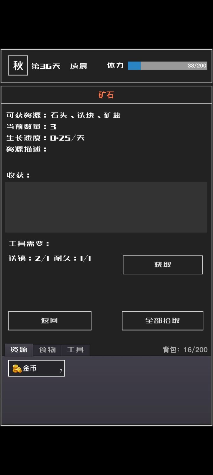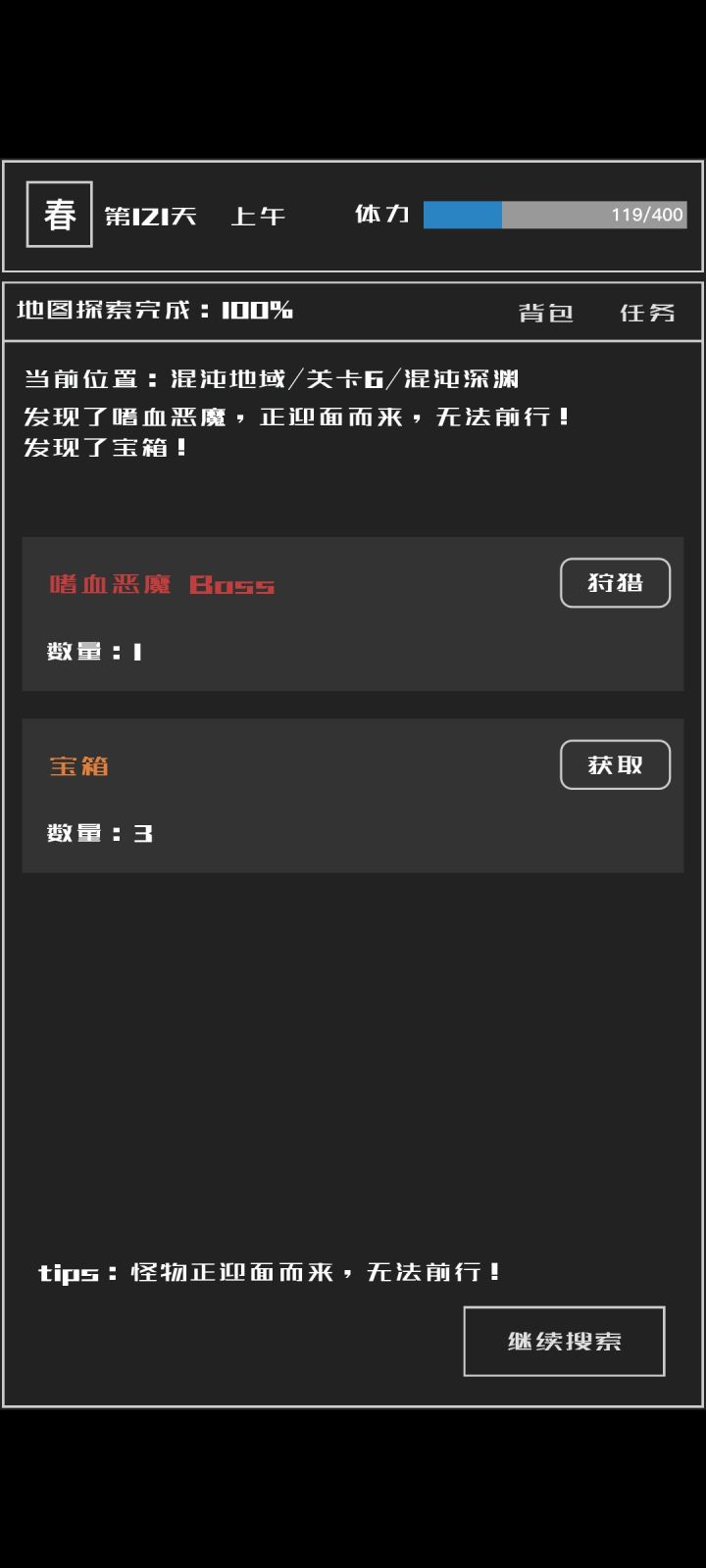 第一个图还没过 目前的感受就是小怪跟资源刷新太慢 图里的资源都拿完了 好几天体力搜不出东西 宝箱开了十几个开不出宝石 卡在9级升不上去 隐藏怪要等到秋天 时间太久 也不能跳过天数 只能重复进图消耗体力