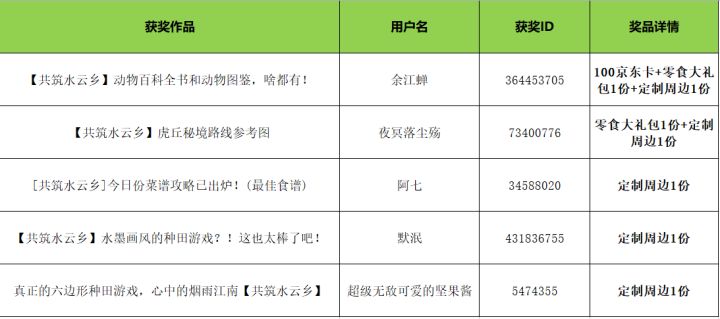 各位仙君大人好: 本次闲云测试征集活动“共筑水云乡”已经圆满结束啦~ 承蒙各位仙君厚爱,我们收获了许多非常用心的参赛作品! 结合仙君们的喜爱度和作品的质量,活动共选出5位仙君获得奖励~ 快来看看都有哪些幸运鹅叭! 【中奖名单】获奖的仙君请注意: 1、获奖作品将会收到@云水蘅芜君 的评论留言,请获奖仙君及时关注。 2、请于7个工作日内加入我们的官方Q群:750563039,将TapT